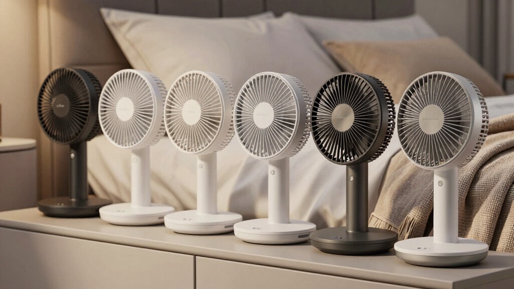 Choosing a quiet room fan for sleep means paying close attention to noise levels, as even small differences can impact your rest. Fans operating below 30 decibels create a gentle, soothing environment, with models around 20-25 decibels resembling a whisper or rustling leaves. Ultrasonic or bladeless fans are especially effective, often producing under 28 decibels, making them perfect for light sleepers. Keep in mind, noise can increase at higher speeds, so selecting a fan with noise-reduction features is key. Some fans incorporate noise-muting technology or sound-dampening materials to further minimize operational sound. These enhancements help ensure the fan remains unobtrusive, allowing for peaceful, uninterrupted sleep. Prioritizing low noise levels is essential for creating a quiet, comfortable sleeping environment.