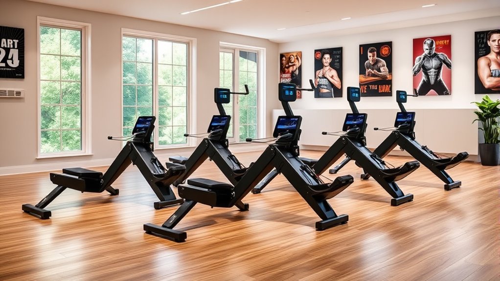 If you’re searching for the best rowing machines for your home gym in 2025, I recommend considering models with durable builds, adjustable resistance, and quiet operation. Top picks include magnetic, water, and air resistance options with features like Bluetooth connectivity, full-body engagement, and space-saving designs. These machines support a range of fitness levels and user weights. Keep exploring to find out which one best fits your workout goals and space constraints.
