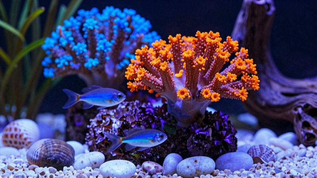 When adding decor to your saltwater tank, considering glow and light effects can truly transform the underwater scene. Glow-in-the-dark or luminescent decor items activate under actinic lighting, creating vibrant, luminous environments that captivate both fish and viewers. The intensity and duration of the glow depend on the materials used, like silicone or resin, and the lighting conditions. Proper placement is essential to maximize visual impact, highlighting key features and creating a calming, mesmerizing atmosphere. Many glow effects can be adjusted through your tank’s lighting settings, allowing you to customize the ambiance and enhance the decor’s luminous qualities. This interplay of light and decor not only elevates the aesthetic but also adds a dynamic, enchanting element to your saltwater aquarium.