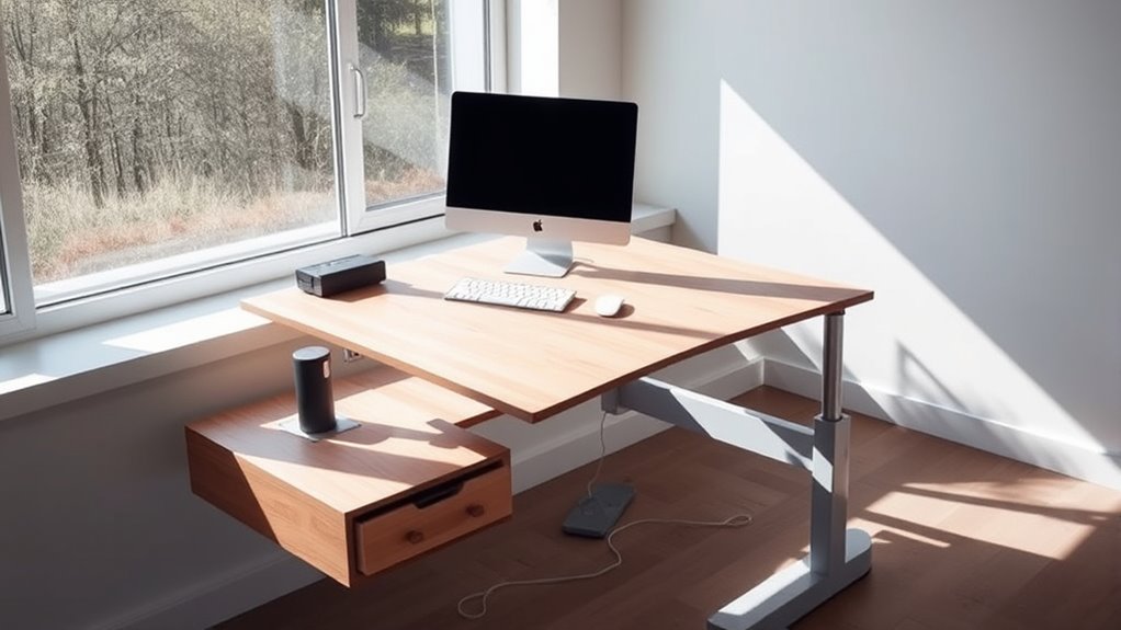 Cable management drawers typically don’t impact desk stability if they’re well-designed and properly installed. I’ve found that sturdy drawers with secure mounts keep cables organized without adding wobble or imbalance. It’s essential to guarantee the drawers are attached correctly and don’t add excessive weight or leverage that could shift the desk’s center of gravity. When installed right, they help keep your workspace tidy without sacrificing stability.
