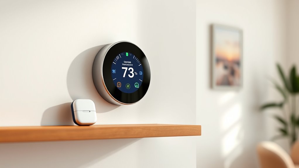 Sensor placement is vital for accurate temperature readings. I always place sensors away from direct sunlight, drafts, or heat sources, like vents or appliances, which can skew results. Positioning them at a consistent height, roughly at your eye level, ensures better accuracy. I’ve learned that spreading sensors across different rooms helps maintain a balanced, comfortable home climate, preventing hot or cold spots and optimizing your thermostat’s performance.