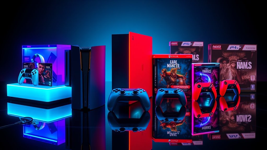 Choosing the right console or bundle involves more than just the initial price; it’s about evaluating the overall value. I always compare the total cost of the console plus any accessories or games included to see if it’s worth it. Reviewing the bundle content helps guarantee I get all the essentials, like controllers, cables, or subscription vouchers, that enhance the experience. Sometimes, bundles offer exclusive games or features that justify a higher price, so I consider those benefits carefully. I also check if the bundle provides future-proof features or expandability options, which can save money long-term. Ultimately, I look for a package that offers the best mix of content, quality, and value, ensuring I get the most out of my investment in the long run.
