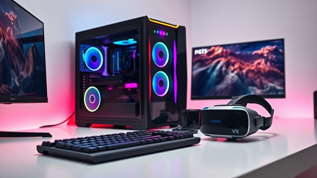 To guarantee smooth VR experiences, a desktop should have at least 16GB of RAM, which helps handle multitasking and keeps gameplay fluid. Faster RAM, like DDR5 at 6000MHz or higher, can further improve load times and system responsiveness during intense VR sessions. Storage is just as important; a minimum of 1TB SSD ensures large game files load quickly and reduces lag. Additional HDD or SSD slots are beneficial for expanding your VR library and content. Adequate RAM and storage are essential for maintaining high frame rates and preventing stuttering in demanding applications. Investing in these components ensures a seamless, immersive VR experience without frustrating delays or performance drops, making your setup future-proof and capable of handling the most demanding virtual environments.