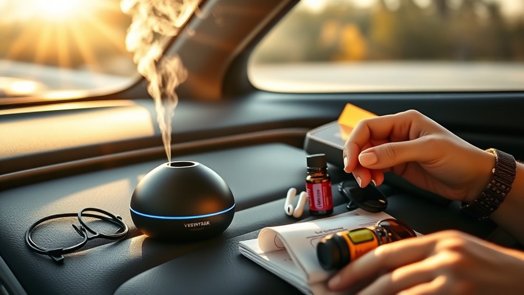 Transform your car into a calming retreat with portable aromatherapy diffusers that are easy to use on the go. Choose battery-operated or USB-powered devices that fit into your cup holder or glove box, and create personalized blends to boost relaxation or alertness. Use travel hacks like pre-filled bottles and diffusing via vents to enjoy the benefits anywhere. Stay tuned to discover more tips to make your journey both relaxing and revitalizing.