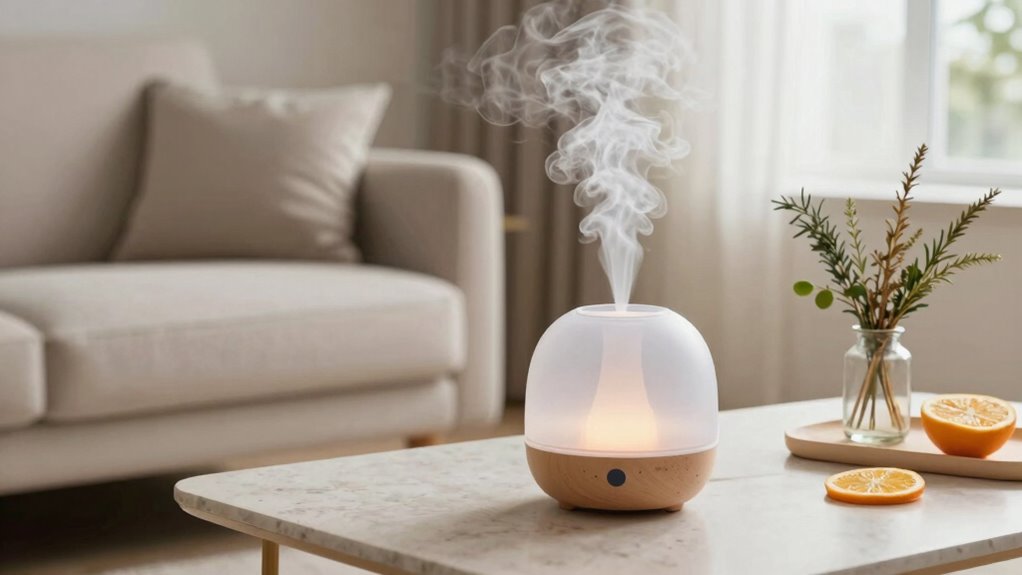 - Test different combinations in small spaces before full diffusion to gauge how they interact. Understanding scent diffusion methods can further improve the balance and longevity of your fragrance blend. Additionally, controlling scent concentration within your space can enhance the overall experience by preventing scent clashing and maintaining a pleasant environment. Being aware of electric power options, like diffusers that operate quietly and efficiently, can also contribute to a better diffusion process.