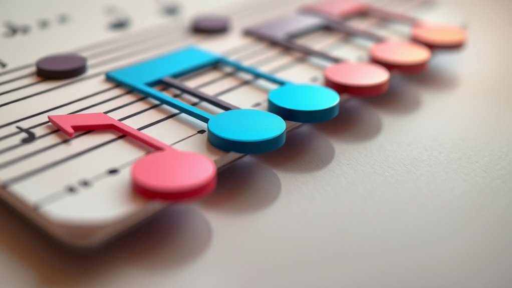The top notes, often called melody notes, carry the main tune and are usually the most recognizable part of a piece. They tend to be the notes that catch your ear first and are essential for emotional expression. When you focus on these, you’re tuning into the emotional core of the music, understanding how a sudden high note can create excitement or how a gentle, sustained note might evoke longing. These notes often define the character of a piece, making their use and placement vital for conveying mood. By analyzing how the top notes interact with the underlying harmony, you can see how emotional expression is crafted—whether a composer uses a soaring high note to symbolize hope or a falling tone to suggest sadness.
