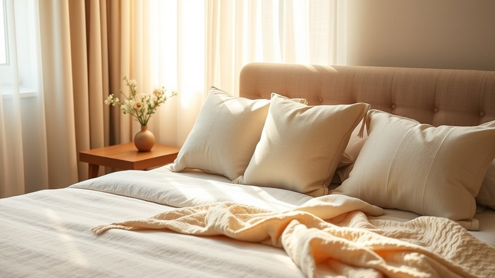 To create a welcoming guest room with gentle diffusing, start by selecting calming essential oils like lavender or eucalyptus and use a diffuser to fill the space with light, natural scents. Keep the environment serene with soft lighting, cozy textiles, and minimal clutter. Add thoughtful touches like fresh flowers or greenery, and make certain the atmosphere feels peaceful and inviting. If you want to discover more ways to enhance your guest’s experience, keep going.