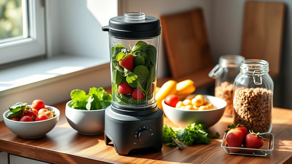 Think of choosing a blender as picking a trusty steed. You want enough power, so look for a high wattage motor that can handle tough ingredients. Check the blade materials—stainless steel blades last longer and blend more smoothly. If you’re blending smoothies daily, a sturdy, powerful blender is your best companion. Consider your typical ingredients and frequency to find the perfect match that keeps your blending journey smooth and safe.