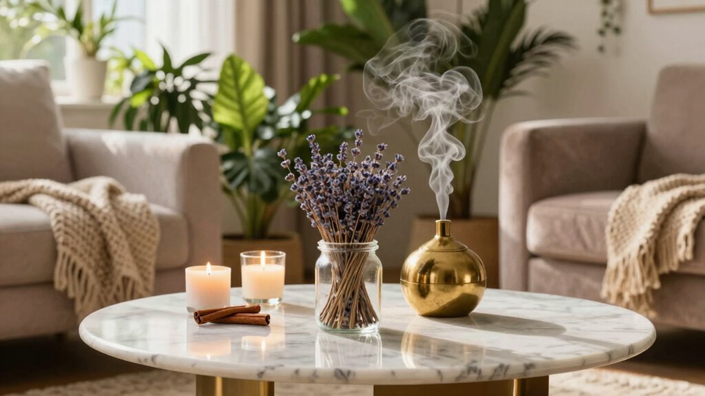Incorporating your signature scent into daily routines and decor effortlessly enhances the ambiance of your home. You can personalize your space through simple DIY projects that embed scent symbolism, creating a cohesive atmosphere. Here are four ways to do it: