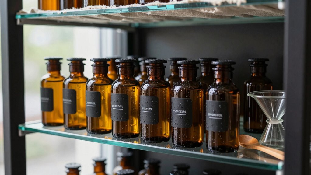 Temperature and light play crucial roles in maintaining hydrosol freshness. Excessive heat accelerates microbial growth, while temperature fluctuations can cause condensation and spoilage. Sunlight degradation is a major concern, as UV rays break down the delicate compounds in hydrosols, reducing their effectiveness. To preserve their quality, keep hydrosols in cool, dark environments. Consider these points: 1. Store hydrosols in opaque containers to block sunlight. 2. Avoid frequent temperature changes by keeping bottles in a consistent spot. 3. Use a thermometer to monitor storage temperature, ideally between 50-70°F (10-21°C). Additionally, understanding the chemical stability of hydrosols can help you select the best storage methods to extend their shelf life and prevent degradation over time. Proper storage conditions not only preserve their therapeutic properties and aroma but also help maintain their freshness and potency.