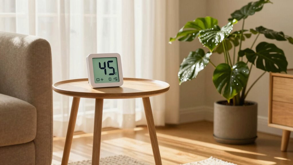 To make certain your home’s humidity stays within the ideal range, you need an accurate way to measure it. A hygrometer is your best tool for this. When choosing one, consider humidity sensor types, such as digital or analog models, to suit your preferences. Digital hygrometers often provide more precise readings and sometimes include features like humidity calibration, which guarantees accuracy over time. Regular hygrometer calibration helps account for sensor drift, keeping measurements reliable. To measure accurately, place your hygrometer in a central location away from windows, vents, or direct sunlight. Proper placement can also help detect hidden humidity issues that may not be obvious otherwise. Using a reliable measuring device ensures you get consistent, trustworthy readings. Additionally, selecting a humidification or dehumidification device based on your hygrometer readings can help maintain the optimal humidity level. Maintaining proper indoor humidity levels is also crucial for energy efficiency and comfort. Regularly monitoring your indoor environment with an accurate hygrometer allows you to make informed adjustments and prevent problems like mold growth or dry skin. Check and calibrate it periodically according to the manufacturer’s instructions. This way, you’ll always know whether your indoor humidity hits that perfect sweet spot.