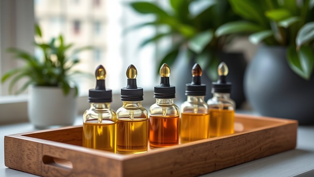 To determine which oils suit your emotional needs, start with an emotional assessment to identify feelings you want to address, like stress or anxiety. Pay attention to your scent preferences, as certain aromas naturally uplift or soothe you. Experiment with small amounts of different oils, noting how each one makes you feel. Trust your intuition and choose scents that resonate positively, creating a personalized aromatherapy experience that supports your emotional well-being.