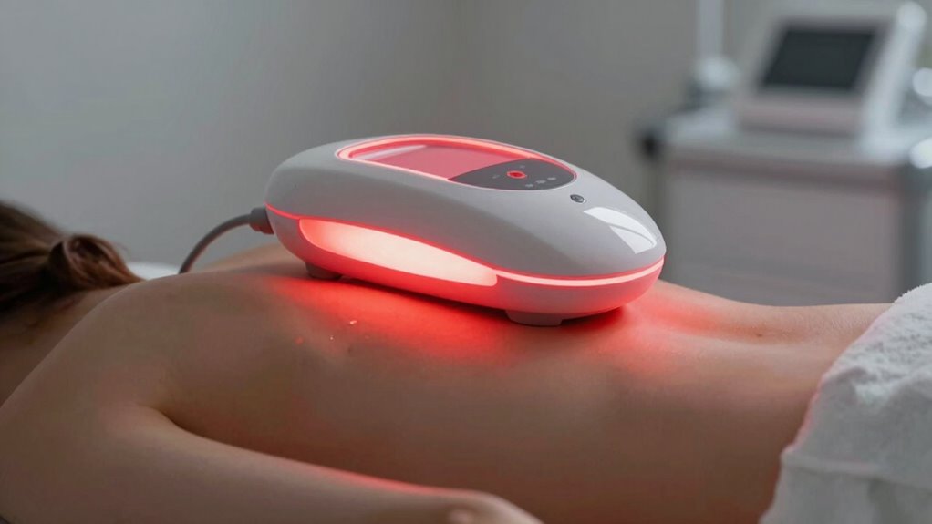 Red light therapy devices typically operate within specific wavelength ranges that target various tissues and promote healing. Wavelength variability allows these devices to penetrate different depths, optimizing light absorption where it’s needed most. For example, wavelengths around 630-670 nanometers are absorbed well by surface tissues, making them suitable for skin applications. Conversely, wavelengths near 810-850 nanometers penetrate deeper, reaching muscles and joints. This variation in wavelength affects the therapy’s effectiveness for different conditions. Shorter wavelengths tend to be absorbed more quickly, providing surface-level benefits, while longer wavelengths reach deeper tissues, encouraging cellular repair. By selecting the appropriate wavelength, you can tailor your treatment to target specific tissues and maximize therapeutic effects. Wavelength selection plays a crucial role in achieving optimal results with red light therapy devices.