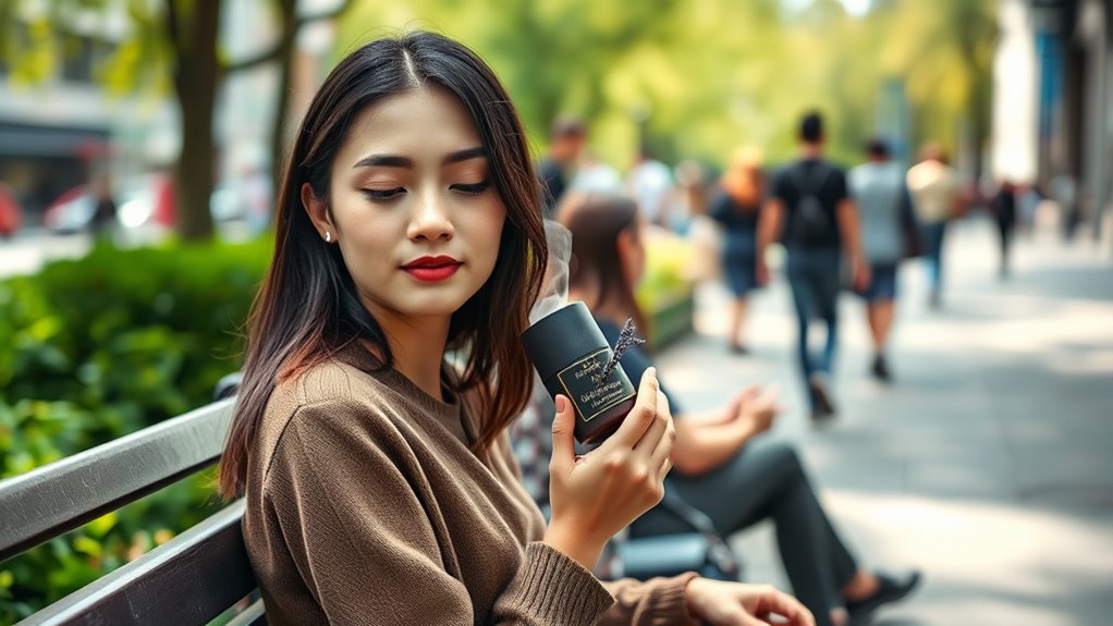 Additionally, consistent use of calming scents can condition your mind to associate these aromas with tranquility. Over time, just smelling these scents can reduce your overall anxiety levels, giving you a mental edge in social situations. Creating positive scent associations through regular practice can enhance the effectiveness of your anxiety management routine. Remember, the key is to be intentional—use the scents as part of your mindfulness routine, not just as a quick fix. Practice breathing exercises and scent inhalation regularly, so they become natural tools in your anxiety management arsenal.