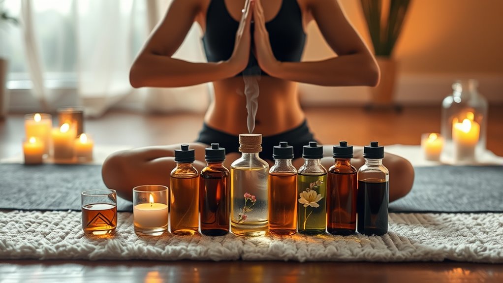 In your yoga practice, sequencing scents by notes can deeply enhance mindfulness and mood. Start with uplifting citrus or peppermint to energize your body. Shift to calming lavender or chamomile to promote relaxation. Finish with grounding scents like sandalwood or frankincense to anchor your practice. Using these aromas thoughtfully can help you connect more fully with each pose and deepen your awareness. Exploring these scent sequences can transform your routine—discover more ways to elevate your experience.